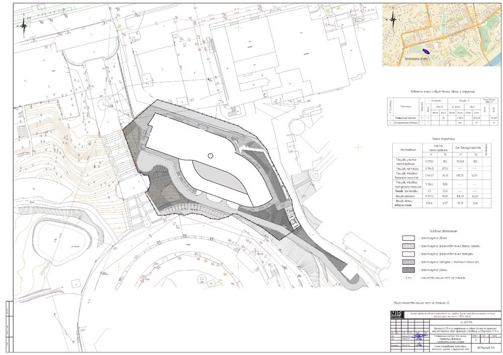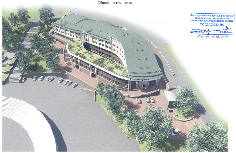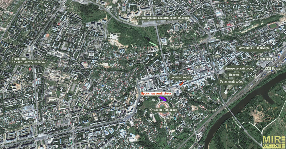 Проект гостиничного комплекса для приема спортивных делегаций с реабилитационным центром выполнен на земельном участкеобщей площадью 9 979,2 м2 по адресу: примерно в 255 м по направлению на северо-восток от ориентира нежилое строение, адрес ориентира г. Владимир, ул.Дворянская, д. 16-а. Генеральным планом городаучасток определен как зона развития спорта и отдыха. Земельный участок находится недалеко от исторического ядра г.Владимира. Главная видовая точка — панорама на стадион «Торпедо».