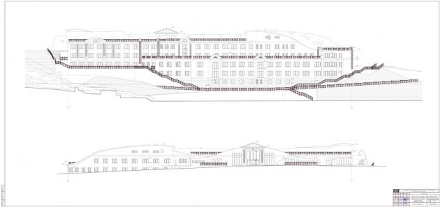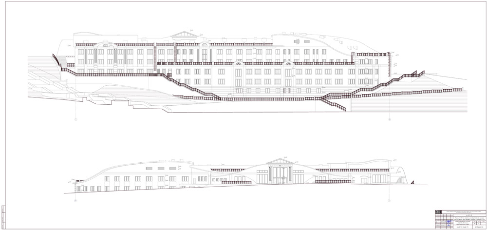 Гостиница размещена на сложном рельефе, поэтому в архитектуре использован элемент террасирования. Зданиемонолитное каркасное с ненесущими наружными стенами. Пространственная жесткость и устойчивость обеспечиваются совместной работой дисков монолитных железобетонных перекрытий и монолитных железобетонных колонн .