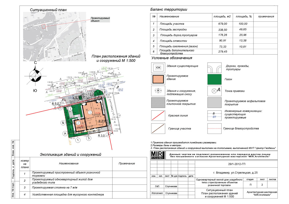 Жилой дом проектируется в глубине участка. Главный вход в магазин ориентирован на ул. Стрелецкая. Загрузка осуществляется с южной стороны здания, с улицы Семашко.