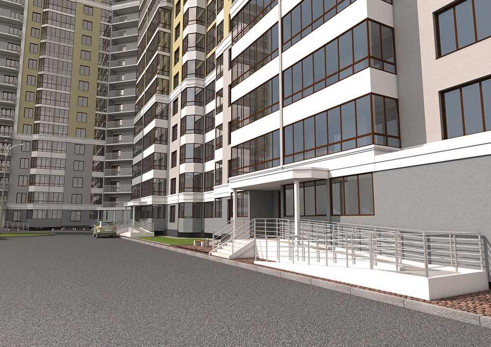 Архитектура здания лаконична, без использования украшений и сложных элементов в оформлении домов. Горизонтальные тяги в виде поясов визуально принижают дом, что облегчает его восприятие с более низкой соседней застройкой. Кровля плоская. Выступающие над кровлей лестничные клетки представляют собой акценты на фасадах. Архитектурный акцент на поворотной секции хорошо читается со стороны въезда в город, за счет увеличения высотности и декоративного элемента, подчеркивающий вертикальныйакцент.
