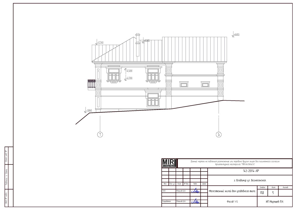 Количество этажей 3 этажа. Из них два надземных, один подземный. Часть в осях 3-5 и А-В представляет собой двухэтажный фрагмент здания, выходящий в сторону ул. Вознесенской и закрепляющий исторически сложившуюся линию застройки по улице. В ней располагается гараж на два машино-места и тренажерный зал. Часть в осях 3-4 и В-Г представляет собой одноэтажный фрагмент здания, который представлен планировочно как входная группа.Часть в осях 1-3 и Б-Г представляет собой трёхэтажный фрагмент здания (включая подземный этаж). Два надземных этажа жилое пространство. В подземном этаже находятся технические и хозяйственные помещения.Связь этажей осуществляется по лестнице. Крыша здания скатная. Уклон основного объема крыши здания составляет 35о. Уклон крыши входной группы составляет 20о. Высота здания в осях 3-5 и А-В от уровня дневной поверхности земли до конька составляет 9,04 метра.