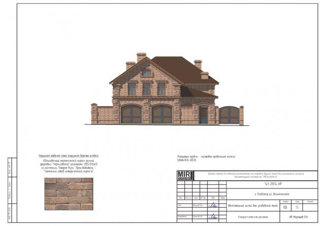 Композиционное решение фасадов представлено членением плоскостей фасадов с помощью пилястр, поясков, а также обрамлениями окон (наличниками). Покрытие кровли выполняется из листового кровельного железа с покраской. Цвет RAL-8028.Наружная верста кладки стен здания выполняется из исторического керамического кирпича ручной формовки. Тип "Новгородский" размерами 250х120х65 из коллекции "Старая Русь". Производитель - "Тюменский завод исторического кирпича".